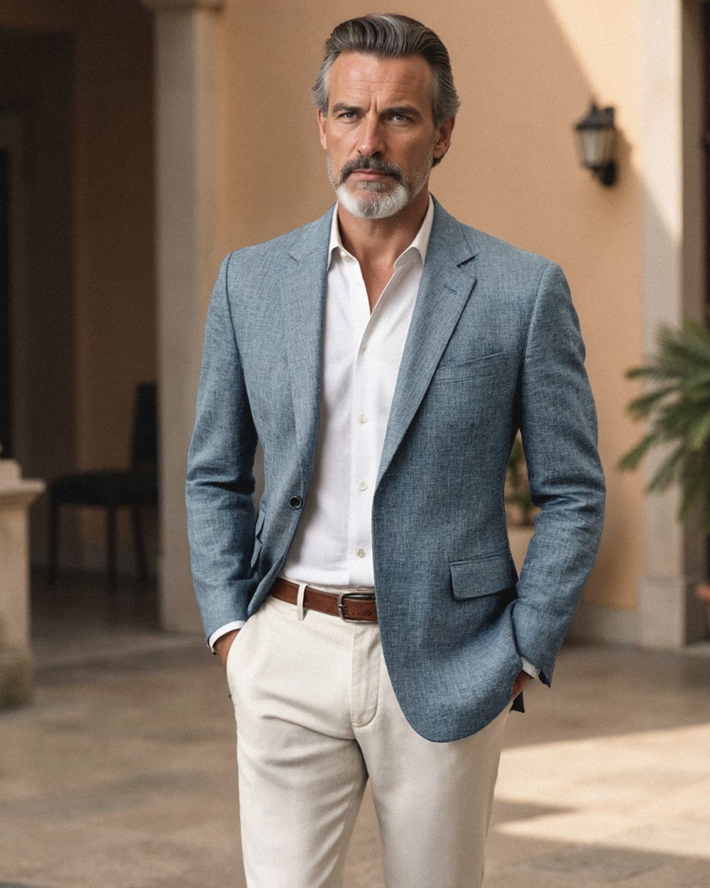 Ideal for summer, this blazer embodies the essence of the season with its seasonal mid-blue tone—a color that is versatile enough to transition seamlessly from beachside brunches to laid-back evening gatherings. The slub thread style imbues the fabric with a subtle, irregular texture, elevating its casual yet refined aesthetic.