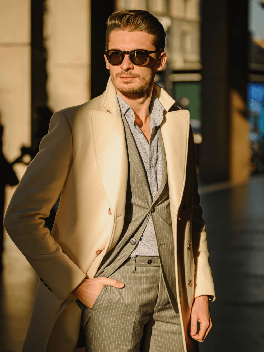 Functionality matches style with the inclusion of diagonal pockets allowing you to easily access essentials or warm your hands on chilly days. The absence of a chest pocket and back vents speaks to the coat’s clean, minimalist architecture, maintaining its streamlined design. Meanwhile, the sleeve hems boast a buttonless finish, contributing to the minimalist aesthetic and guaranteeing a clean appearance.