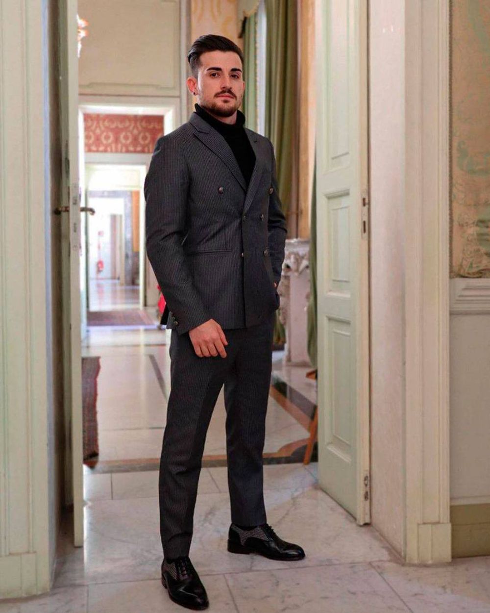 The six buttons double-breasted blazer is the gentlemen choice although it is becoming a really popular choice. Our craftmanship experts are ready to cut the Pure wool fabric needed to start tailoring your suit with all the style choices you made: Double-breasted jacket, peak lapel and 2 pockets among others.At Hockerty every single suit is made to measure, so you can customize this design or you can create your own here: Custom Suits.