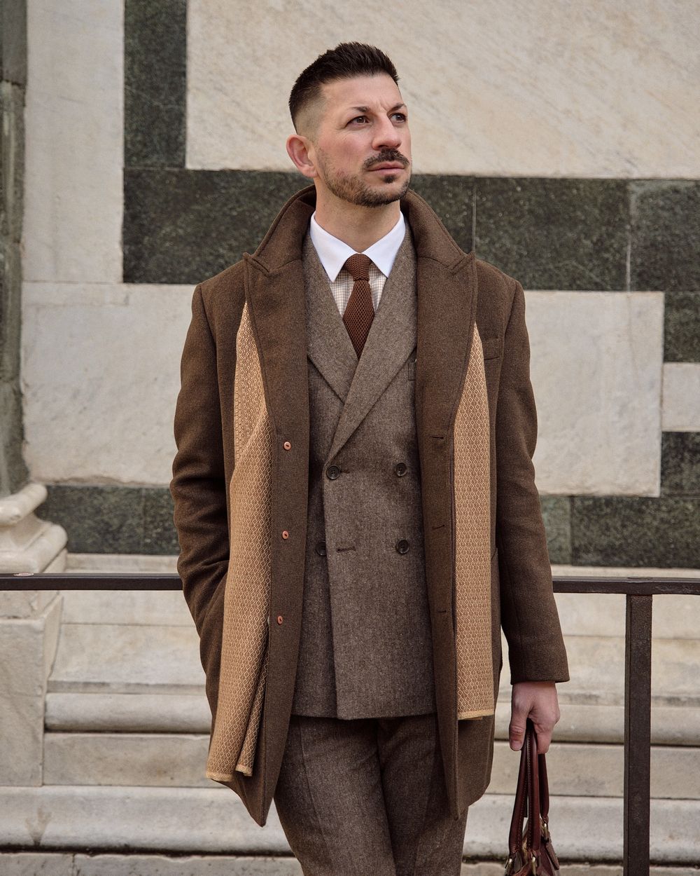 Crafted from premium essential wool blends, this overcoat provides the perfect balance of warmth and breathability. The woolen thread ensures a solid fabric texture, adding a rich, tactile dimension to the sophisticated brown tone. This palette is versatile, seamlessly fitting into any wardrobe while providing an air of understated luxury.