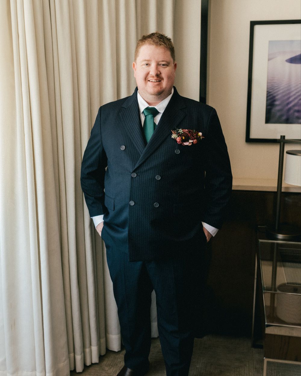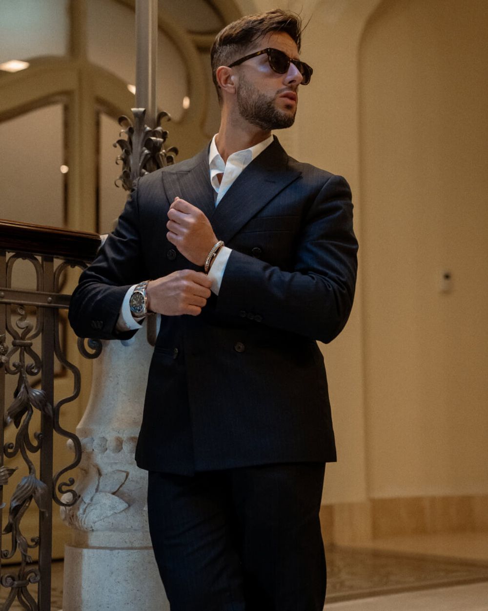 The suit's double-breasted jacket showcases a six-button closure, elegantly complemented by peak lapels. This combination not only exudes authority but also captures the essence of timeless, confident style. The slim fit is tailored to perfection, enhancing the body's natural lines and creating a sharp silhouette, ideal for both professional settings and upscale gatherings. Attention to detail is evident in the double-welted pockets, offering both an aesthetic appeal and practical use.